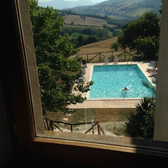 The apartment has on one side a beautiful view of the front garden and on the other side a beautiful view of the pool and the Apennines.