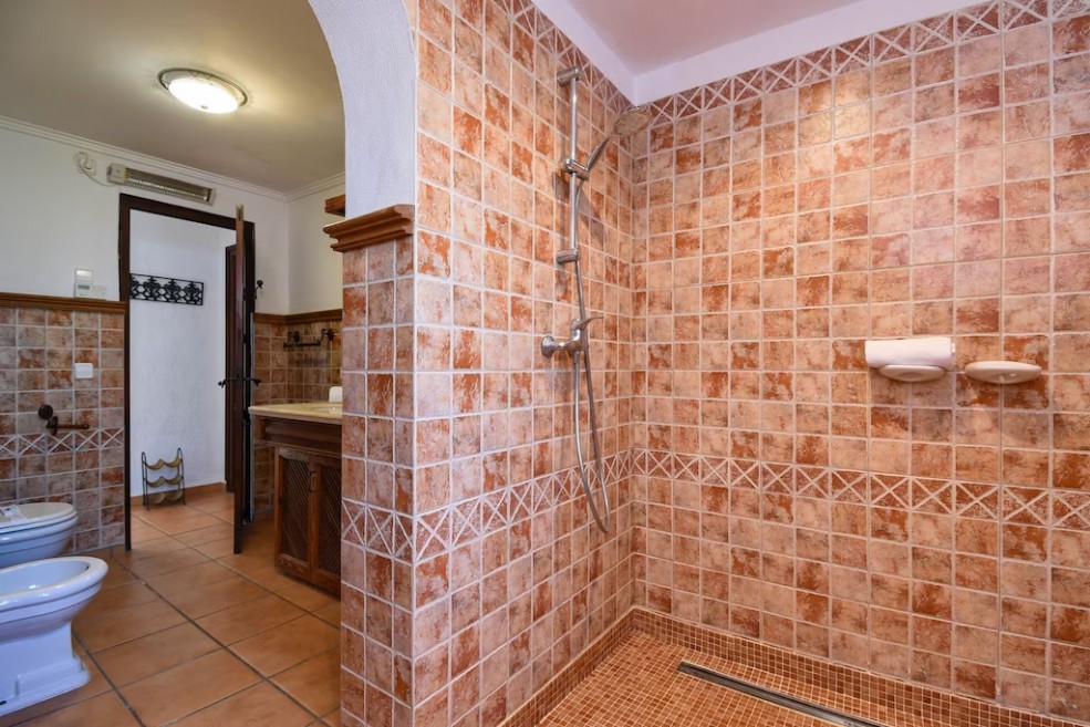 - bathroom with double washbasin, shower, bidet and toilet