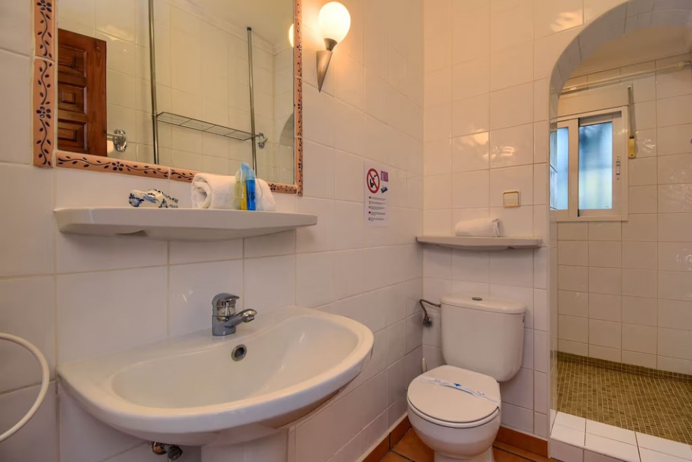 - en-suite bathroom with single washbasin, shower, toilet and hairdryer