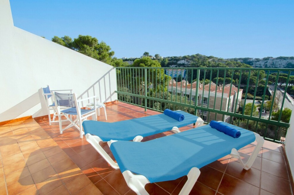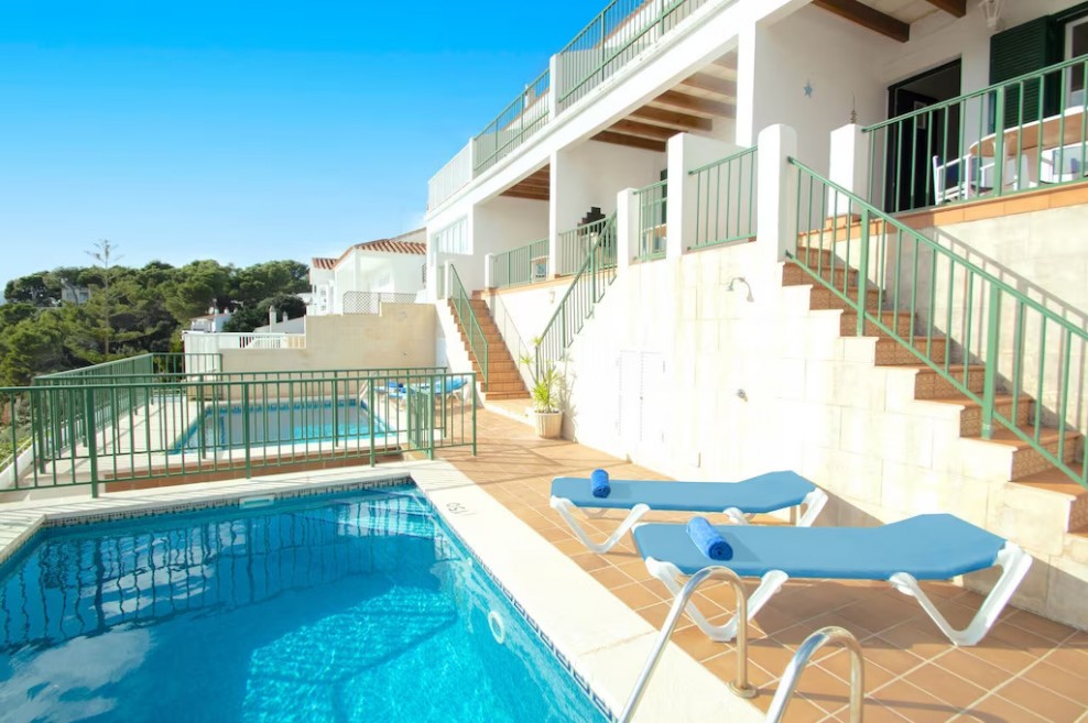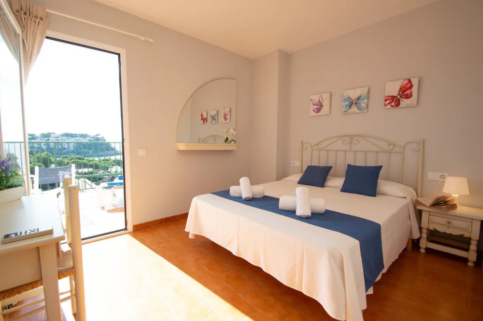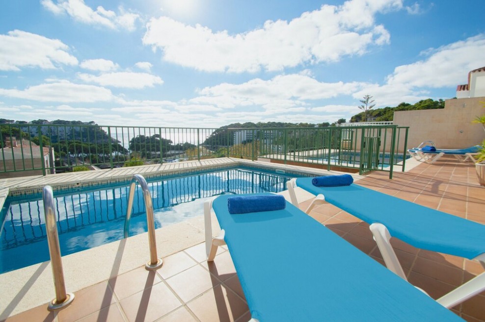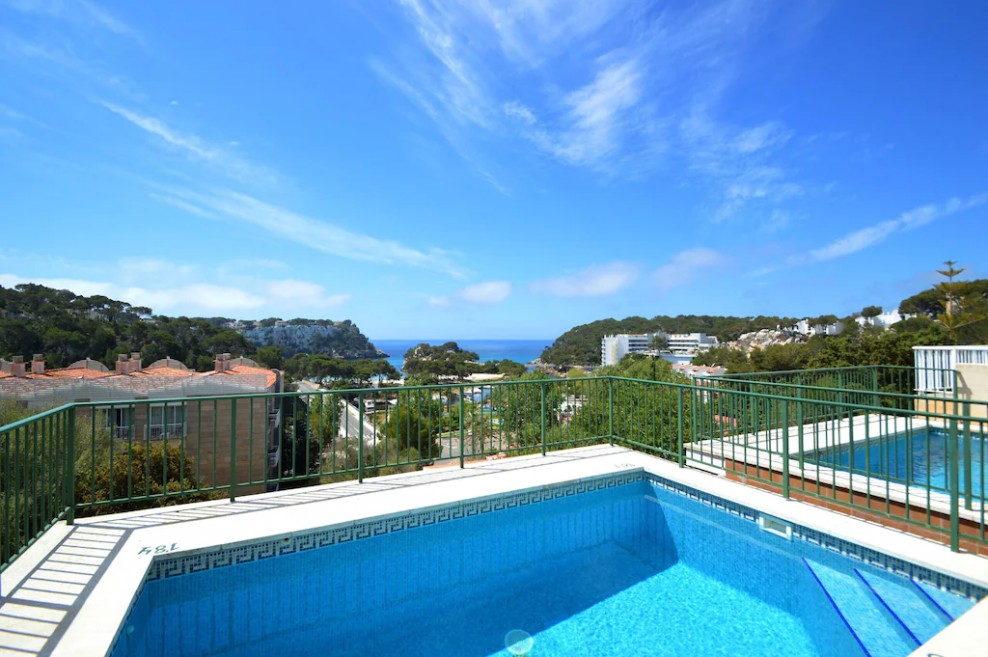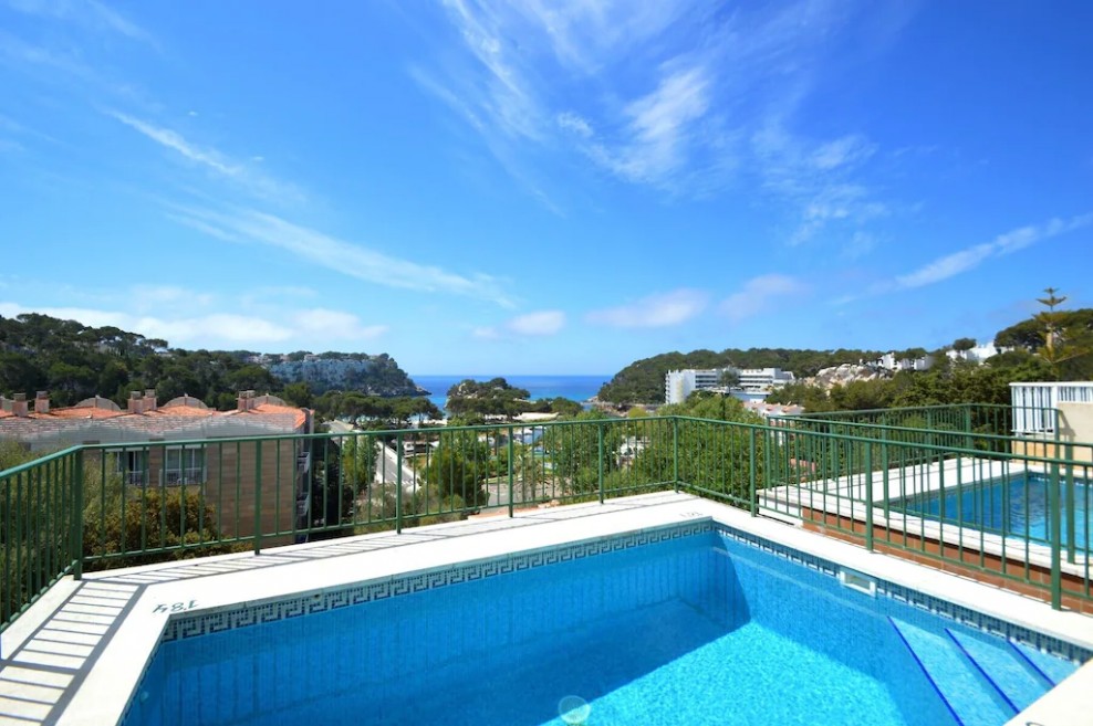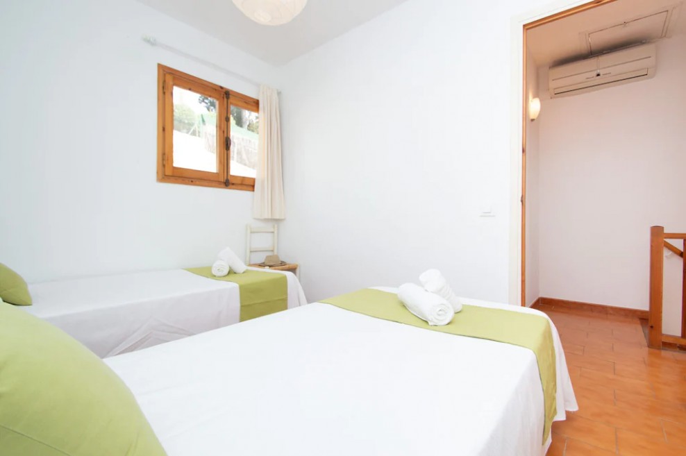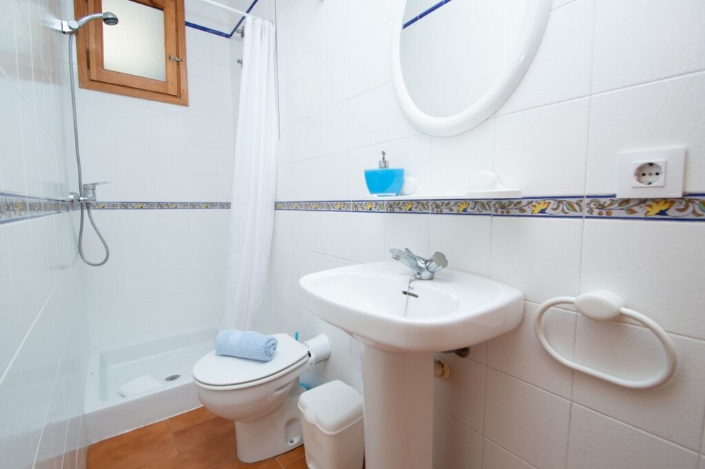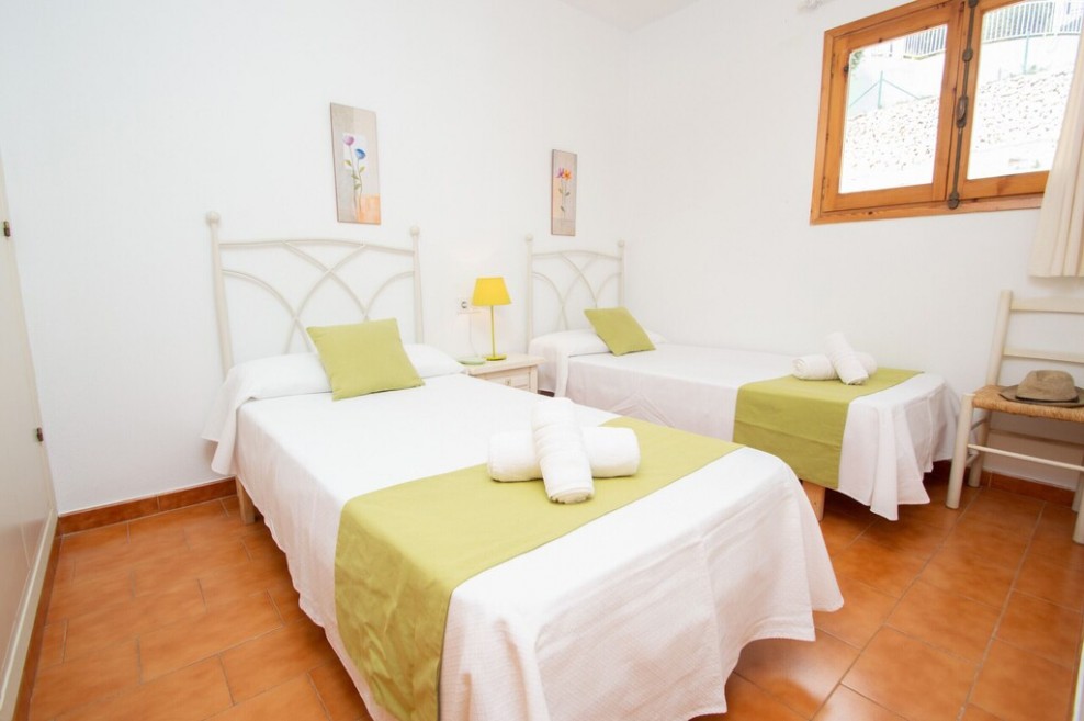 The upper floor consist of a double bedroom with double bed which has a large private balcony offering spectacular views to Cala Galdana, while the second bedroom has two single beds and both have a fitted wardrobe. On this floor you will also find a family bathroom with bath and hairdryer.