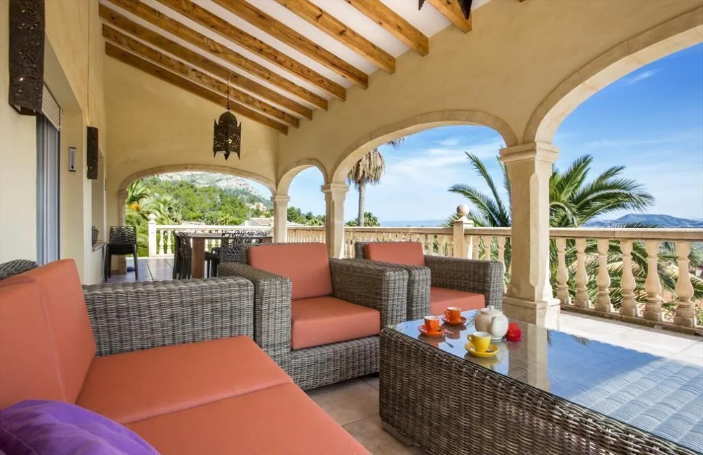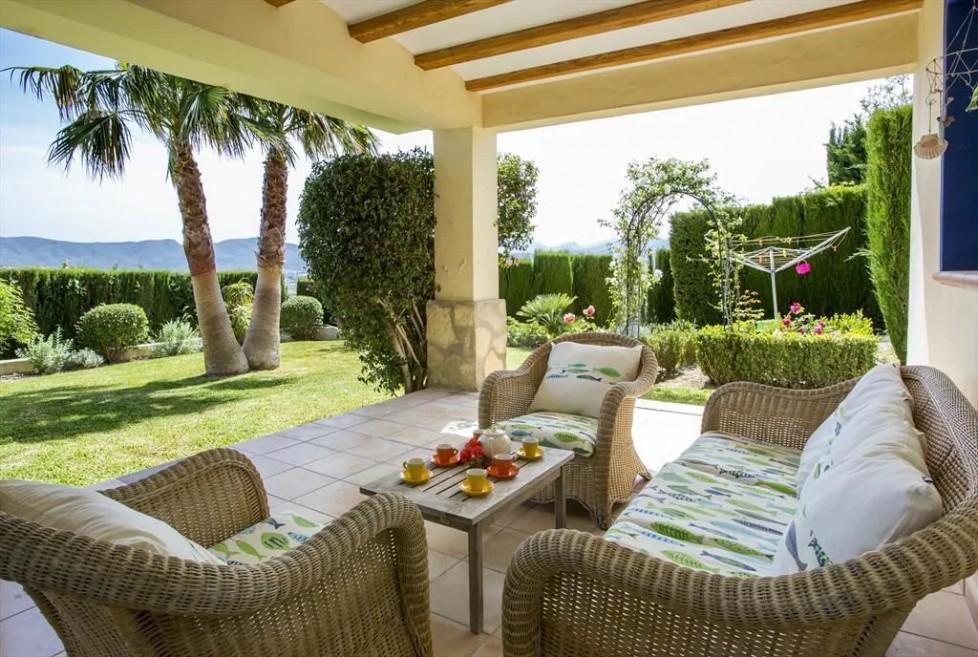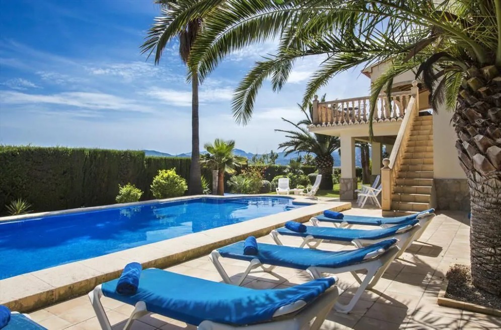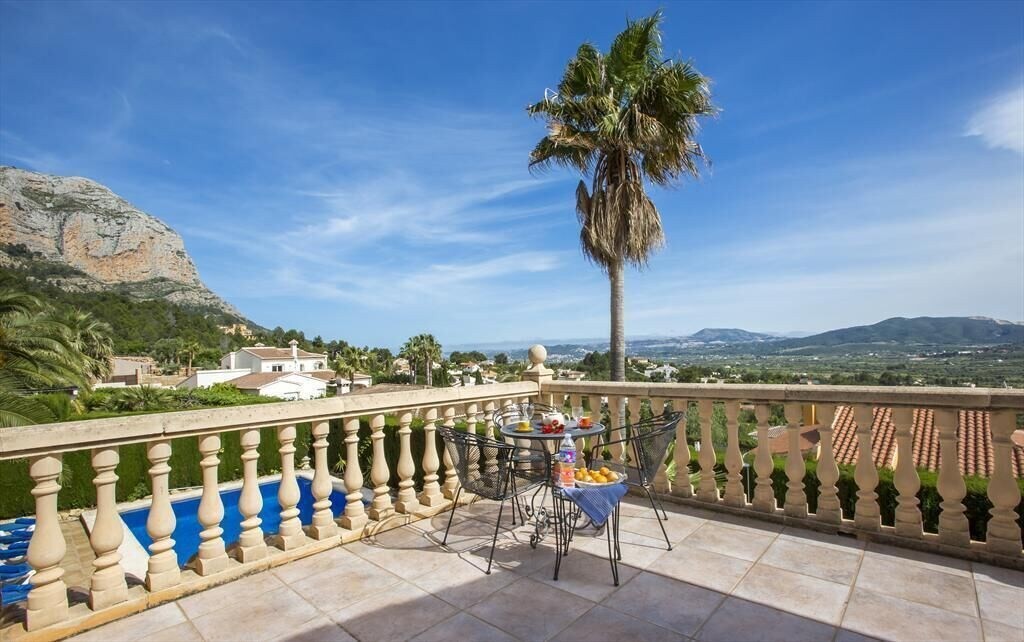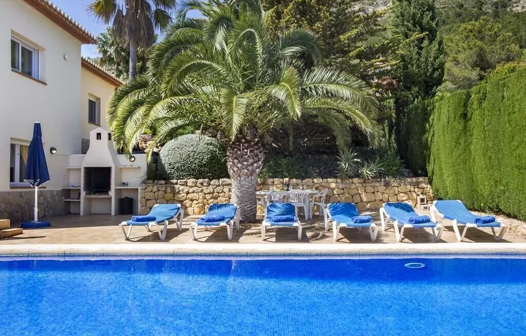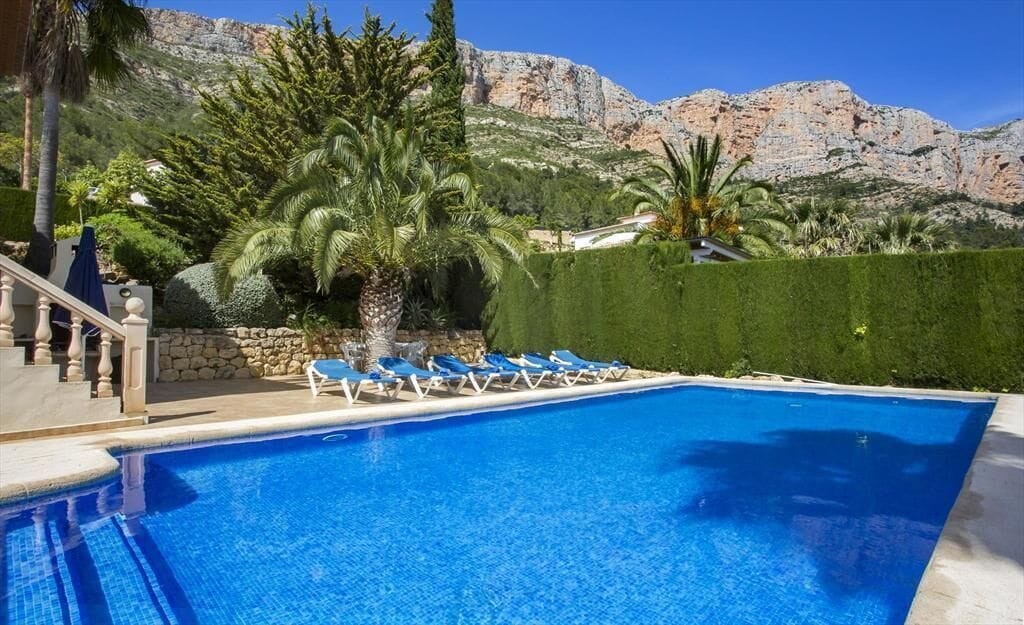 Large and comfortable luxury villa with private pool in Javea, Costa Blanca, Spain for 10 persons. The villa is situated in a residential beach area. The luxury villa has 4 bedrooms and 3 bathrooms, spread over 2 levels. The accommodation offers privacy, a beautiful lawned garden with trees, a beautiful pool, wonderful views of the valley and beautiful views of the mountains. Its comfort and the vicinity of the beach and sports activities make this a fine luxury villa to spend your holidays in Spain with family or friends.