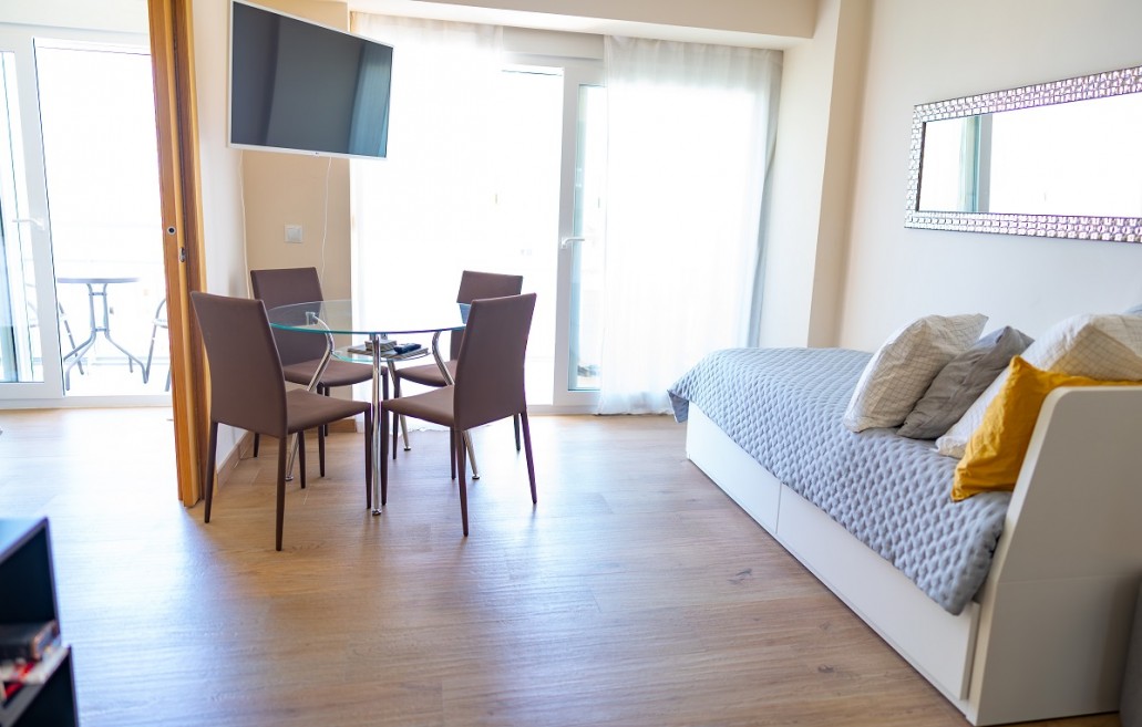 The apartment features a comfortable living room, with a large sofa bed (sleeps two), a table with four chairs, and a fully equipped kitchen.