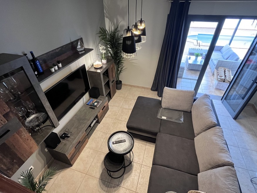 A welcoming living area is open plan with the kitchen. It has a wall mounted, flatscreen TV, with Netflix, Video on demand, and an IPTV satellite system providing over 100 channels, including all British, Irish and Scottish channels. There is a large, comfortable L shaped sofa to relax and enjoy your entertainment. Complimentary WIFI is provided for your convenience. A patio door leads out to the al fresco dining and chill out area, together with sun and pool terrace. An internal staircase leads up to two bedrooms and the family bathroom.