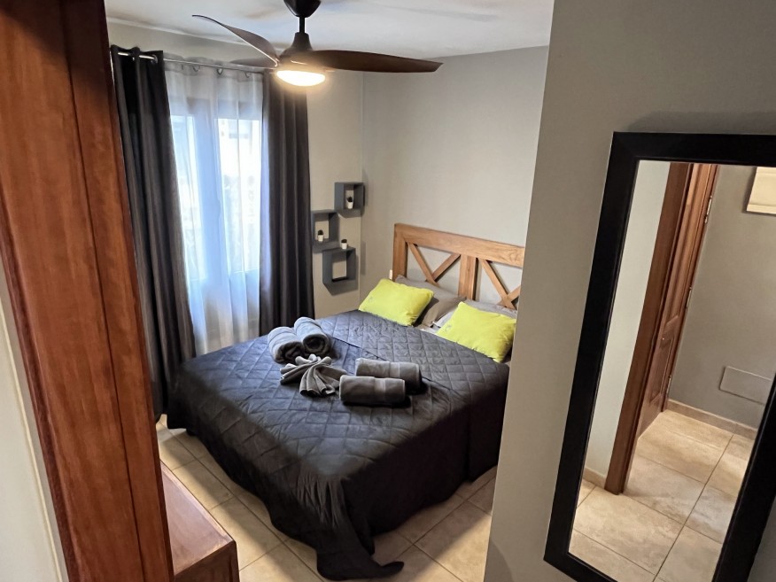 Ground Floor – Double bedroom (150cm x 200cm) with overhead lighting and fan, which is remote control operated. Fitted wardrobes. There is a wall mounted flat screen TV with aerial that provides Spanish channels.