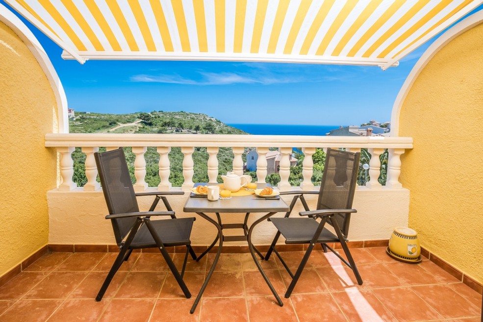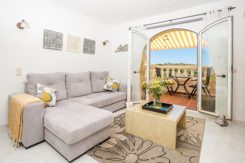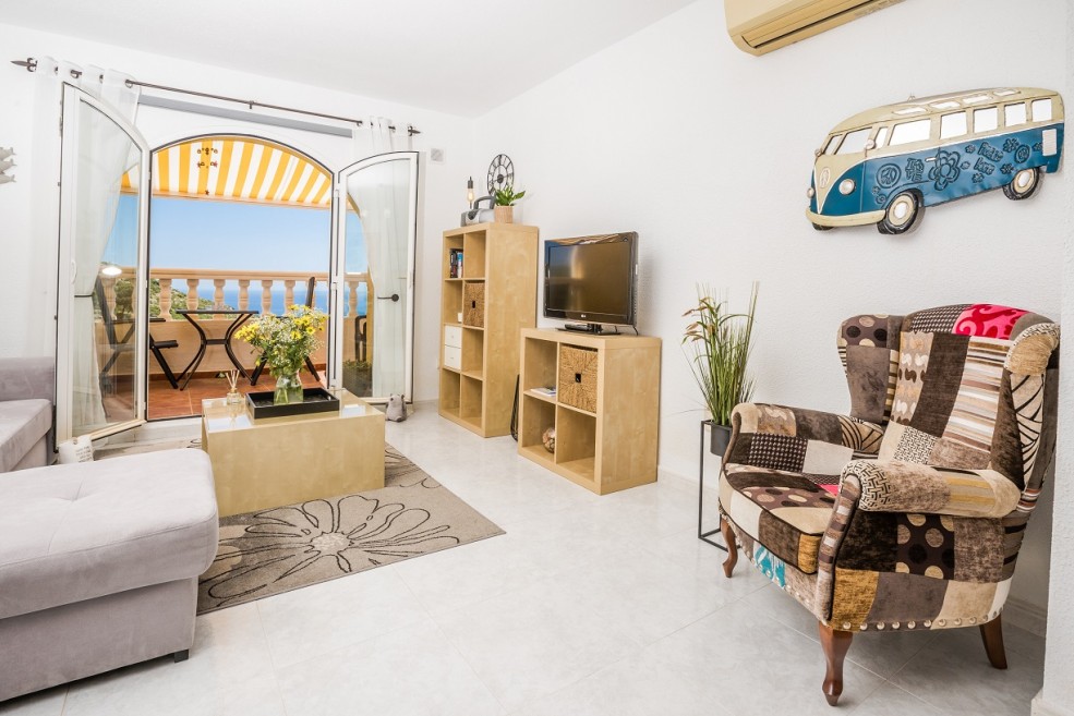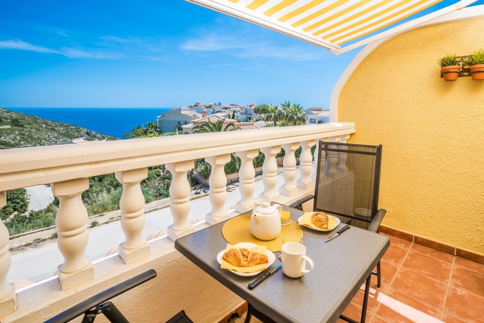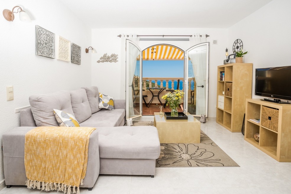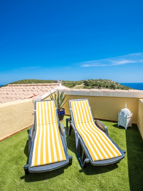 Top floor apartment with sea views in Pueblo de la Paz (Cumbre del Sol), with a total built area of 76 M2 (49.45 M2 of home, 8.75 M2 of terrace, 15M2 of solarium, and 3.40 M2 of common). The apartment has two bedrooms, a sofa bed in the living room, one bathroom, a terrace, an American kitchen with equipment, and a small garden on the ground floor, as well as air conditioning in the living room. The bathroom has been tastefully remodeled and equipped. We also have a sundeck with stunning views of the sea. The property faces southeast and provides stunning views of the sea from the living room, bedroom, terrace, and solarium.