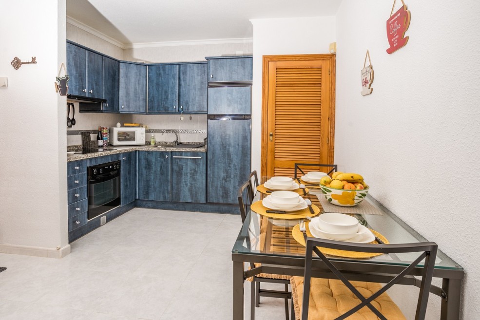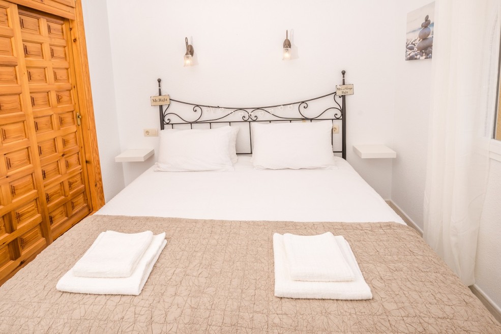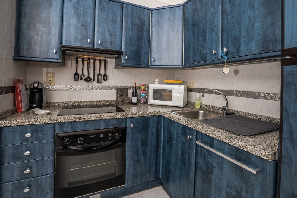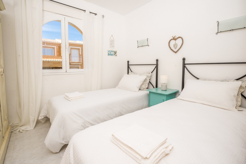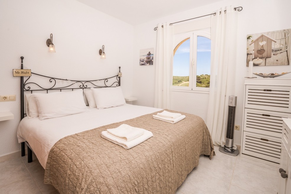 Top floor apartment with sea views in Pueblo de la Paz (Cumbre del Sol), with a total built area of 76 M2 (49.45 M2 of home, 8.75 M2 of terrace, 15M2 of solarium, and 3.40 M2 of common). The apartment has two bedrooms, a sofa bed in the living room, one bathroom, a terrace, an American kitchen with equipment, and a small garden on the ground floor, as well as air conditioning in the living room. The bathroom has been tastefully remodeled and equipped. We also have a sundeck with stunning views of the sea. The property faces southeast and provides stunning views of the sea from the living room, bedroom, terrace, and solarium.