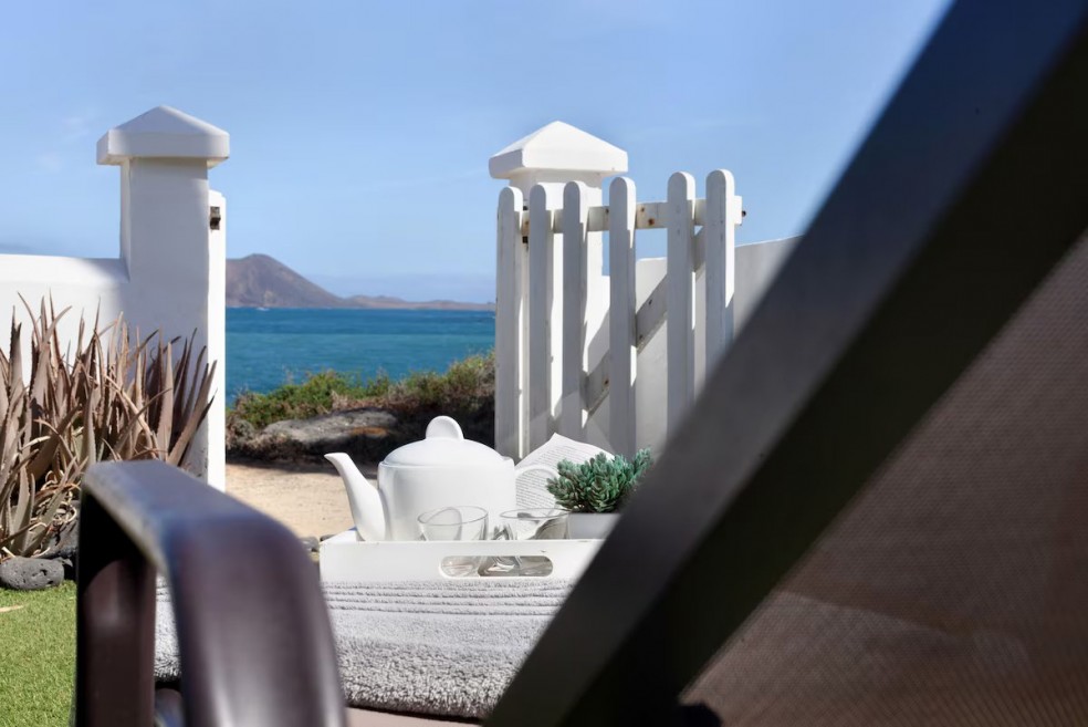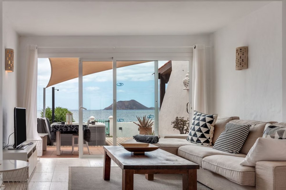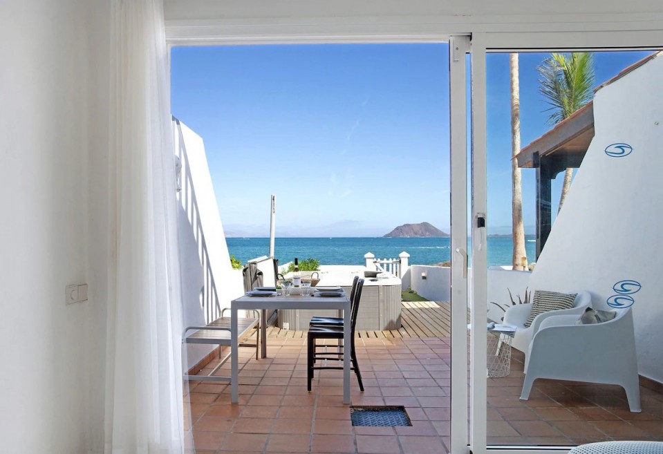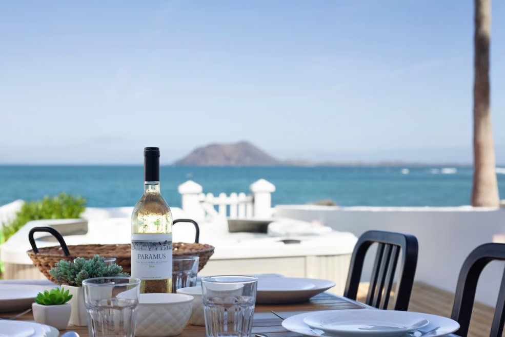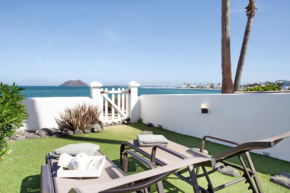 The lovely refurnished seafront villa “Luxury Oceanfront” is situated in Corralejo, in the north of Fuerteventura, and perfect for relaxing holidays on the wonderful island. The 2-storey villa consists of a living room, a well-equipped kitchen, 2 bedrooms (one with 2 single beds) as well as one bathroom and can therefore accommodate 4 people. Additional amenities include Wi-Fi, a safe and a television. On the first floor, there is a balcony with a gorgeous view of the sea, on which you can start your day with a coffee before enjoying breakfast on the sunny terrace on the ground floor. The jacuzzi is a great way to relax, as well as the deck chairs in the grass field, where you can bask in the sun before cooling off in the glistening sea, literally 20 m from the villa. The closest supermarkets are 650 m (8-minute walk) from the property and the nearest restaurants are 450 m (6-minute walk away). An 8-minute walk (650 m) from the home, you will find the town’s main street with numerous shops, restaurants, bars and cafés. Corralejo is next to a silent volcano, the “volcanes de bayuyo”, which is only a 14-minute drive (6 km) away, and there are hiking trails leading all the way up. The airport is located 40 km (32-minute drive) south of Corralejo.