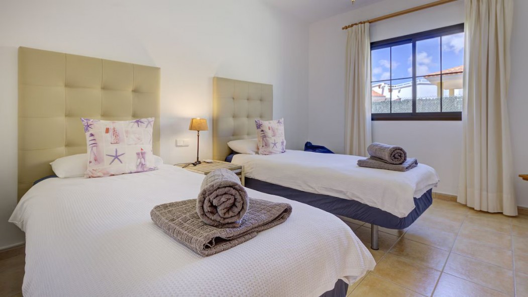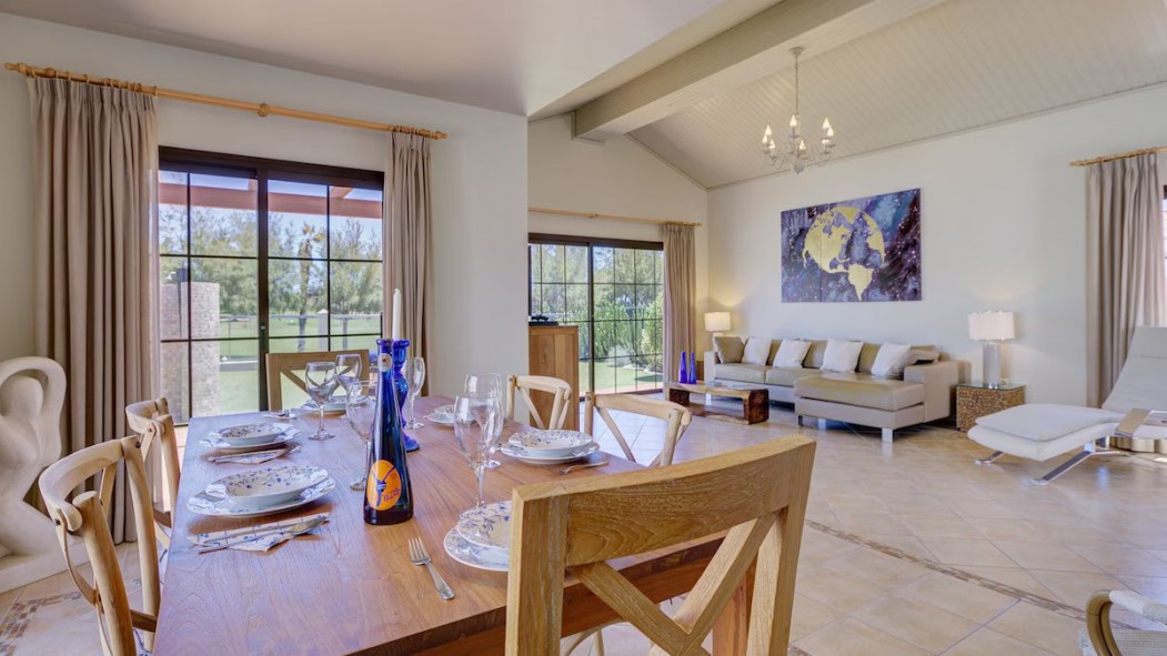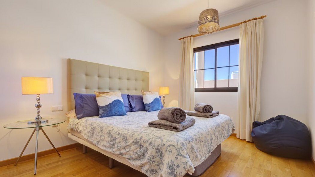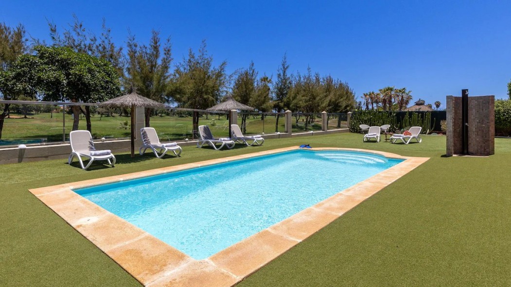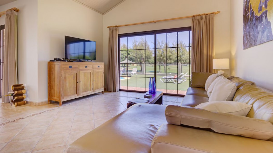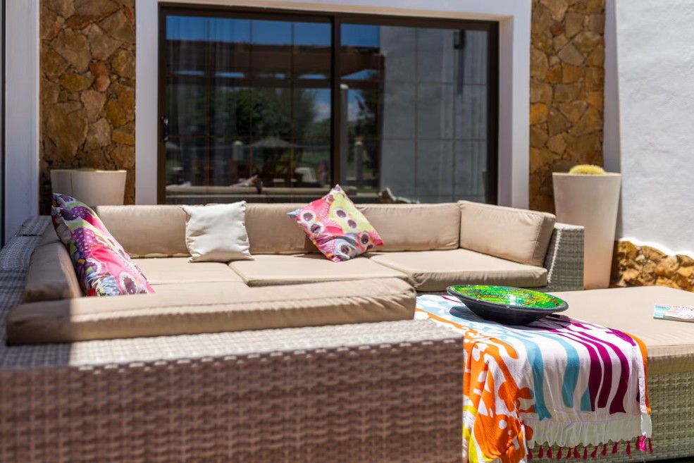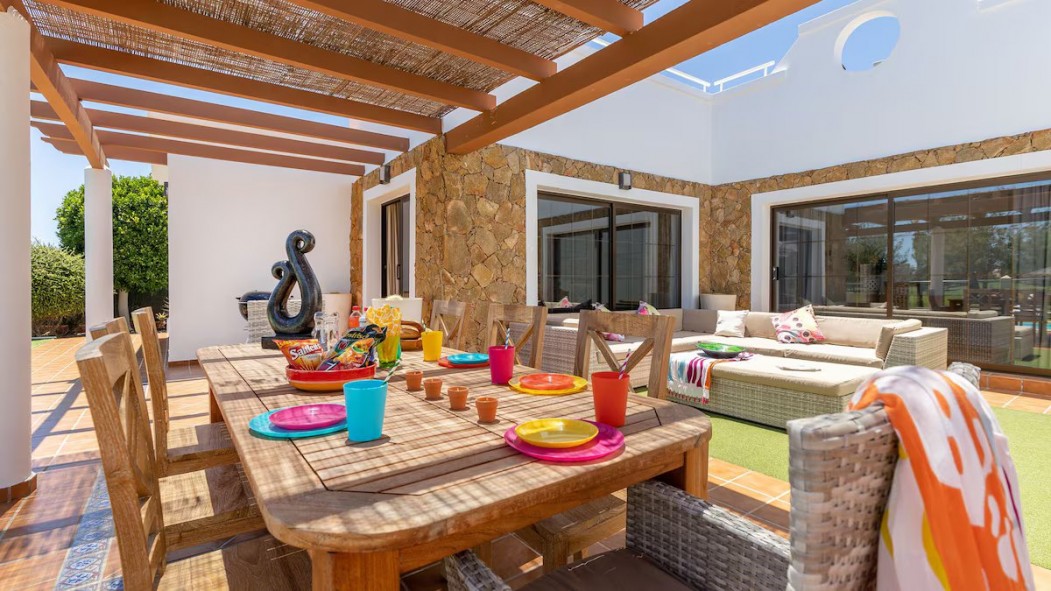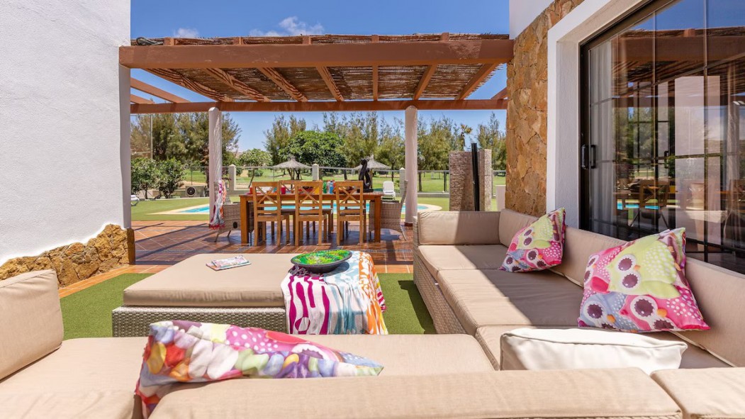 Superior 4 bed villa, with ample open living space. Large planted and grass garden with heated pool and relaxing sun loungers. Car parking is safe and immediate to the house. The interior living space flows between the kitchen, dining and seating areas. A comfortable couch allows you to watch a movie, read quietly or relax for conversation time! There is also a separate office desk for computer work. An eight seater dining table is a great forum for lively lunches even though most of our meal times are spent outdoors at the outdoor dining table. There are four generous bedrooms. 2 of them are double bedrooms, one of these has direct access to the pool. The other double room in en suite. There are two twin bedrooms. Each bedroom has black out curtains for light sleepers or early wakers! A large communal bathroom is available for all bed rooms, as well as a guest bathroom in the entrance hall. Stepping into the garden brings it's many additional layers of the property into immediate focus. The BBQ area, the dining area, the pool and loungers, and the lushness of the garden is complimented by the trees and vegetation on the golf club. A glass wall defines the boundary of our house, but this is often forgotten as the greenery of both house and golf course blends together. The property is on one level with few steps to navigate, other than at the entrance to the house. There is also a vast roof top terrace with stunning views of the beach and golf course.