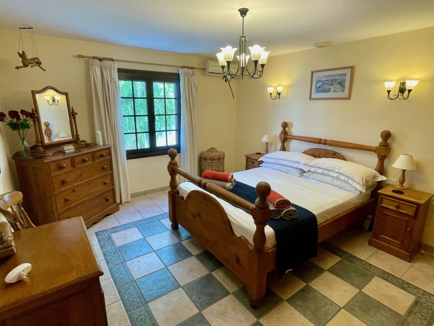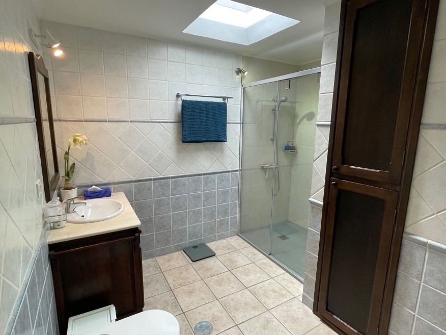 Bedroom 1: King-size bed, fitted wardrobe, TV, air conditioning, large en-suite bathroom with shower.