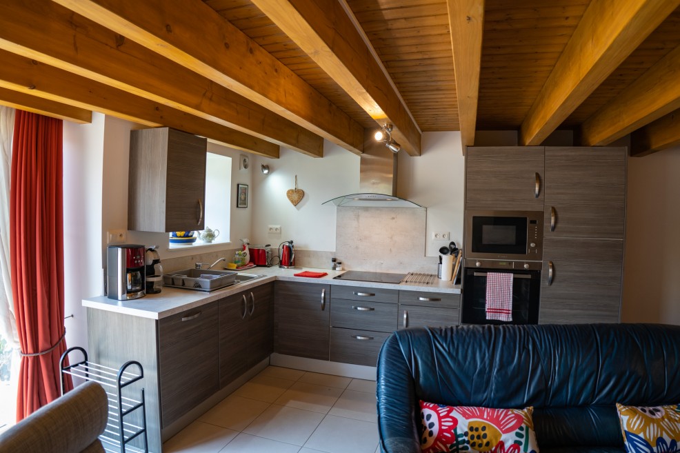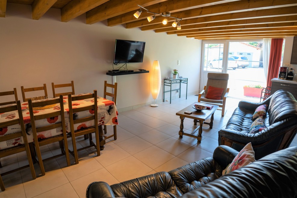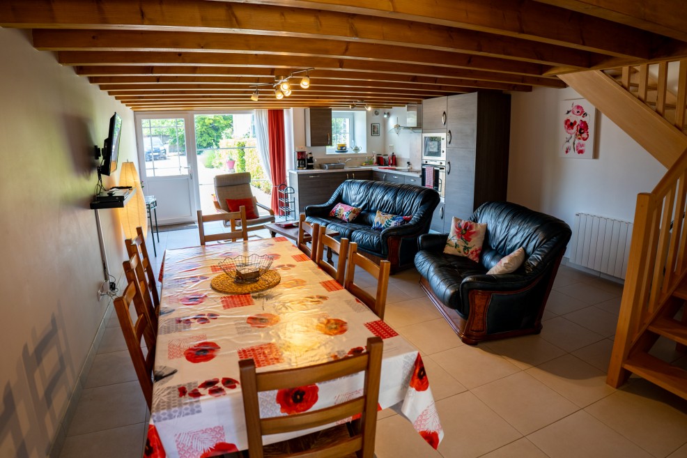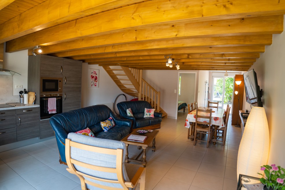 The open-plan main living area (40m²) includes a fully fitted, well-equipped kitchen. The comfortable lounge offers sofas, armchairs and bean bags, making it a welcoming space for the whole family. When the weather is less favourable, gather in the dining area to enjoy relaxed meals together around the dining table.