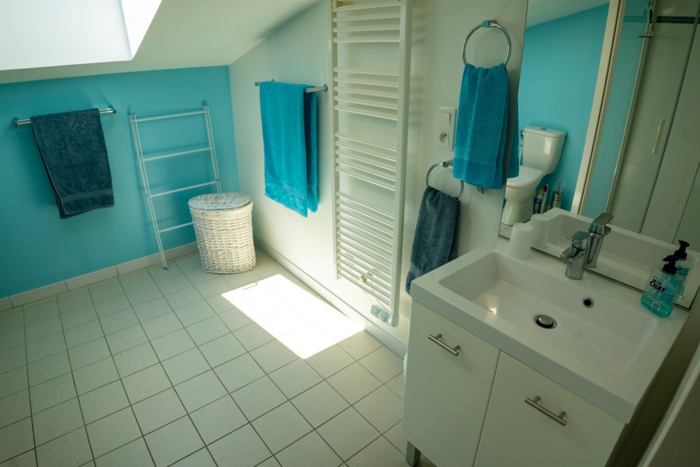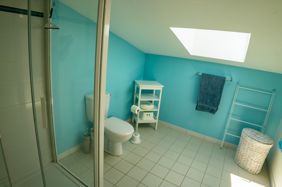 The family bathroom (7m²) has low headroom but is well laid out, offering a shower, toilet, wash-hand basin and vanity unit.