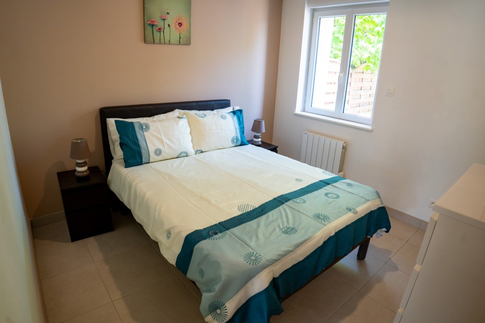 Bedroom 3 (11m²) is located on the ground floor and features a double bed, wardrobe and chest of drawers. The window is fitted with an electric external roller shutter, providing effective blackout for a restful night’s sleep.