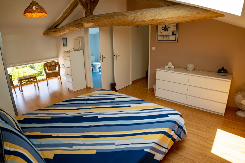 The master bedroom with ensuite (22m²) is a bright and spacious room with a low-level window running across the front wall and a large Velux window to the rear. Exposed timber beams add warmth and character. The room includes a king-size bed, ample storage with a wardrobe and three chests of drawers, plus a small sitting area—perfect for reading or quiet reflection.