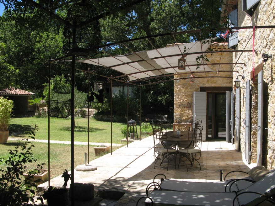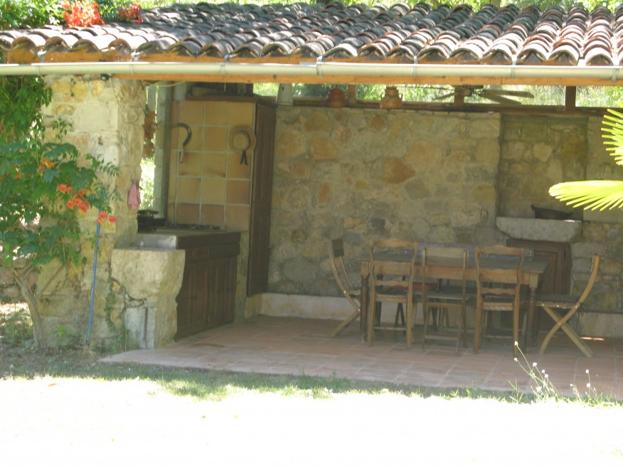 The home also includes a fully-equipped summer kitchen with BBQ and plancha, located just off the shaded terrace—perfect for al fresco dining at the large outdoor table.