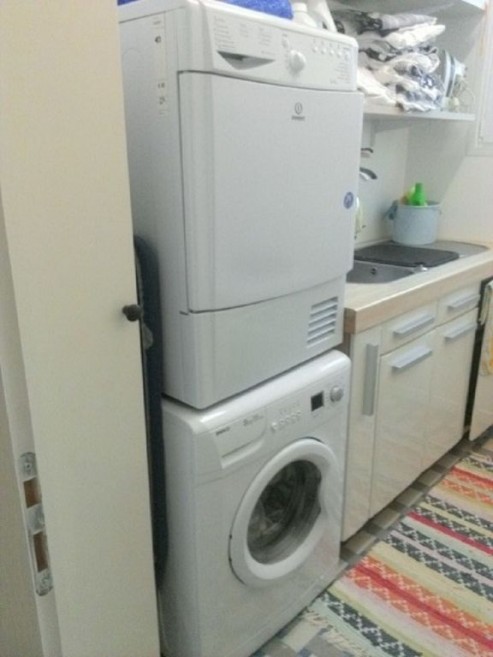 Laundry room with washer, dryer, and folding table