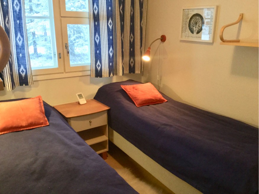 Onnenmaa is located at Suopunkitie 1 C 10. The surface area of this terraced house apartment is 43 m2. The combined kitchen and living area has a fully equipped kitchen area, a fireplace, a smart TV, and a sofa bed (width: 140 cm). The apartment also has a bedroom, a sauna, and an outer storage space. There are sleds in storage and the parking lot has an outlet so you can plug in your car’s block heater. There is a washer and a drier in the sauna area.
