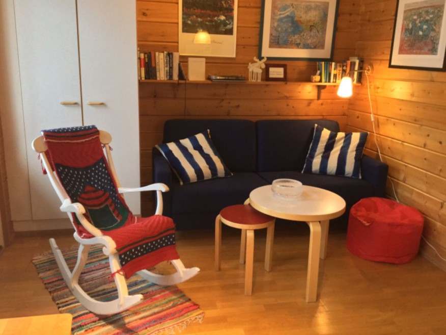 , The living area of this terraced house is 43 m2. The combined kitchen and living area includes a fully equipped kitchen area, a fireplace, a smart TV and a sofa bed (width: 140 cm). The apartment also has a bedroom, a sauna and an outside storage space. The parking lot has an outlet where you can connect the block heater of your car.