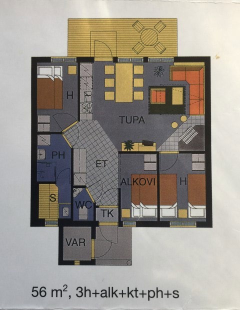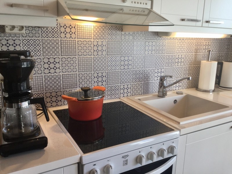 The bright rooms are situated on the same floor. The big south-facing terrace can be accessed from the combined kitchen and living area. All furnishing was renewed in Autumn 2015. The apartment has three separate sleeping spaces and is comfortable and suitable for a family with up to three children or even two couples.