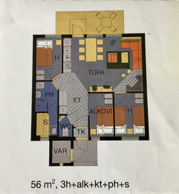 The bright rooms are situated on the same floor. The big south-facing terrace can be accessed from the combined kitchen and living area. All furnishing was renewed in Autumn 2018. The apartment has three separate sleeping spaces and is comfortable and suitable for a family with up to three children or even two couples.