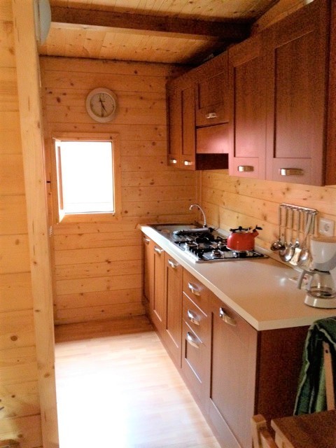 The chalets have an open kitchen with a gas cooker with four hobs and a fridge.