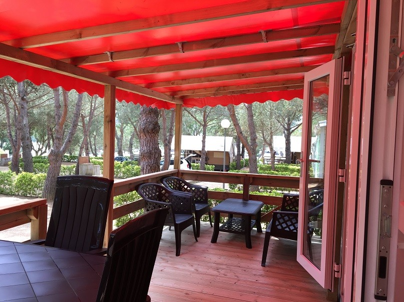 The chalets have 4 permanent beds. Each chaletta also has a large covered veranda, equipped with a dining table and 4 garden chairs and a lovely lounge set for up to 4 people.