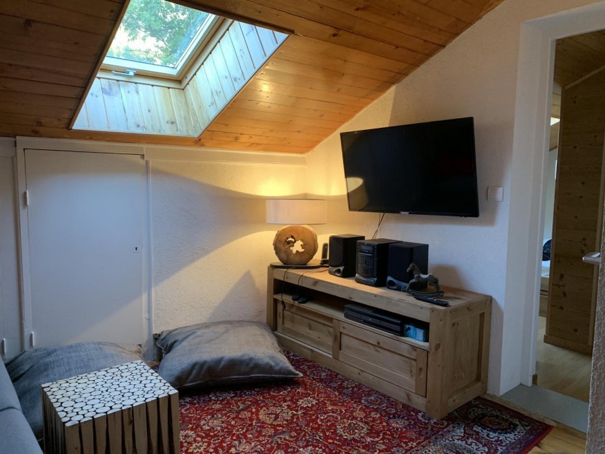 Upstairs, you'll find three sloping bedrooms, each offering comfortable double beds (160 x 200 cm), a single bed (90 x 200 cm), and a small cabin bedroom with two pull-out single beds (80 x 200 cm). A mezzanine lounge area with a TV provides a cozy space for relaxation. The upper floor also has a bathroom with a shower and a separate WC.
