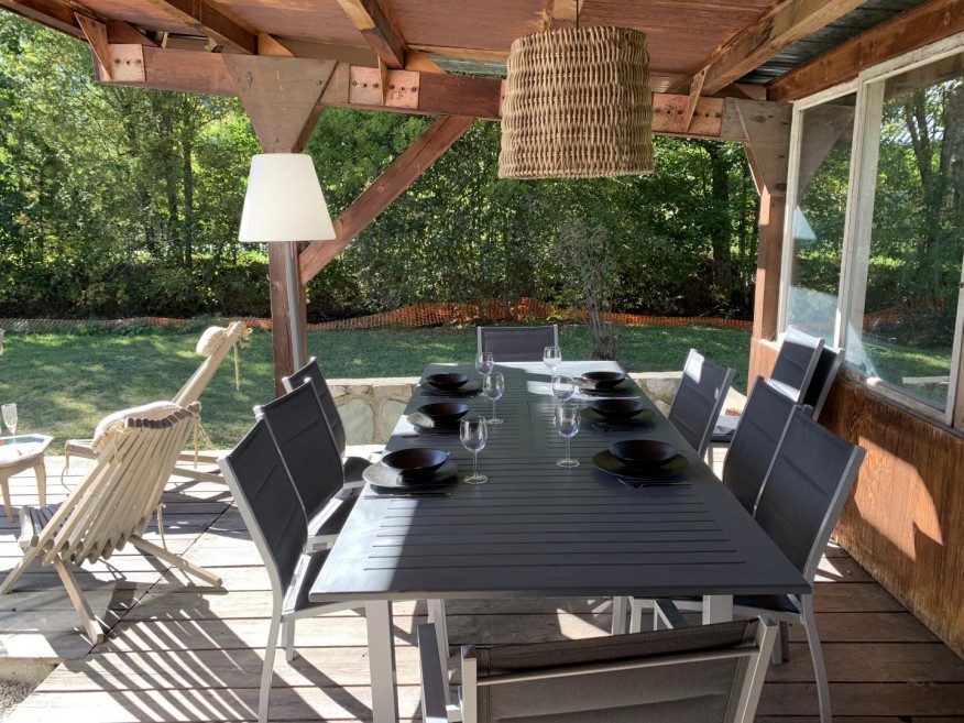 Step outside onto the sheltered terrace adjacent to the kitchen, where you can enjoy your meals while taking in the tranquil views of the surrounding landscape. The flat 1300 m² land, bordered by a river, provides a serene setting for relaxation, with plenty of space for children to play and explore.