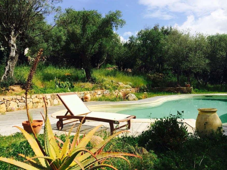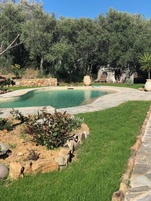 Landscaped swimming pool with azure water, set among ancient olive trees, flowering grass, and succulents