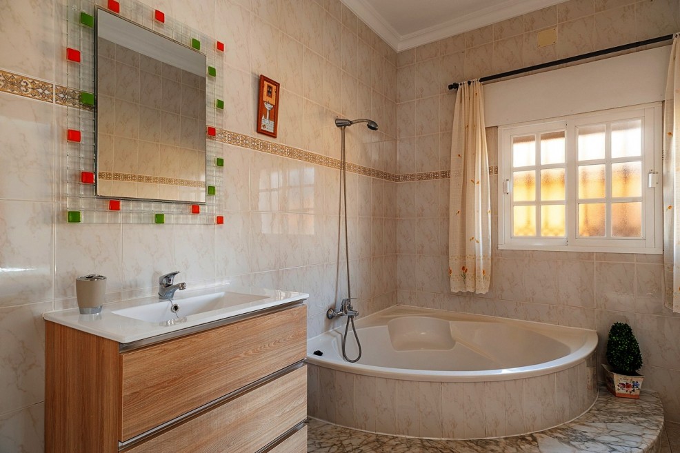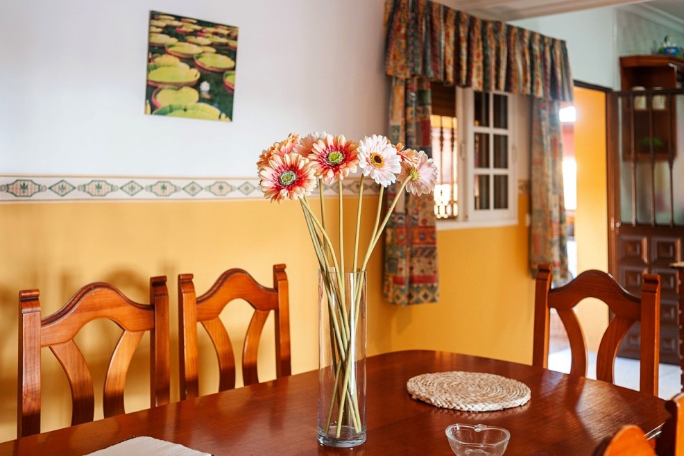 With classical decor the holiday home consists of a living room with white archways and a rustic fireplace, a dining room with beautiful glass vases, a very well-equipped kitchen with a dishwasher, 3 bedrooms (2 with 2 single beds each) as well as 2 bathrooms and can therefore accommodate 6 people.