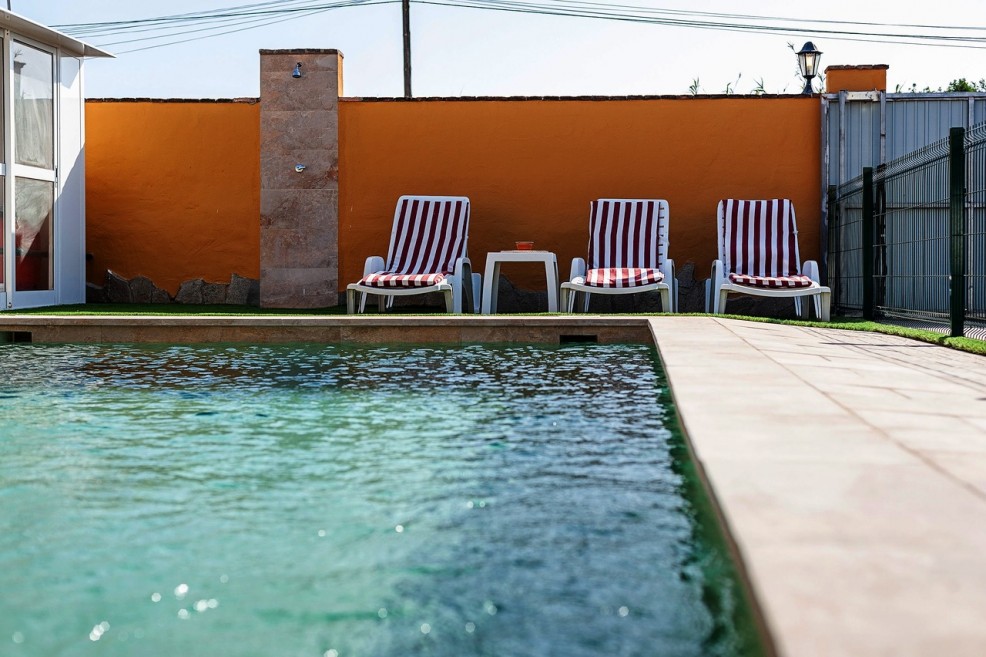 In the spacious outdoor area of the property, you will find a fenced pool with sun loungers and an outdoor shower where you can relax and refresh yourself under the afternoon sun.