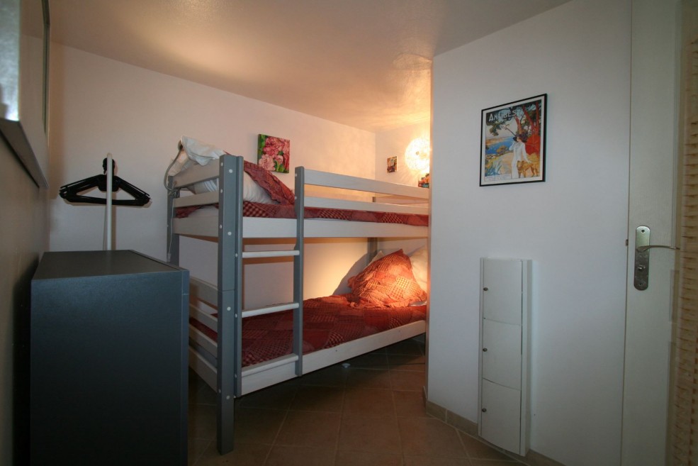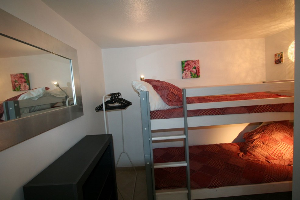Inside, the apartment features a living area with a well-equipped kitchen, a double bedroom, and a second smaller bedroom with bunk beds—ideal for children. A shower room and toilet are located adjacent to the second bedroom for easy access.