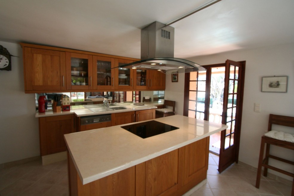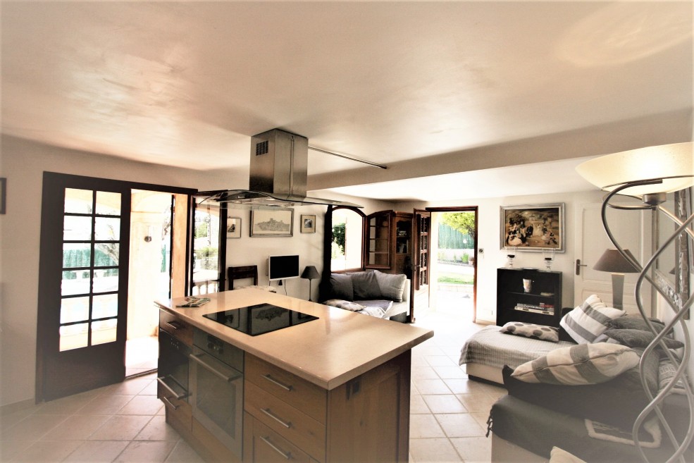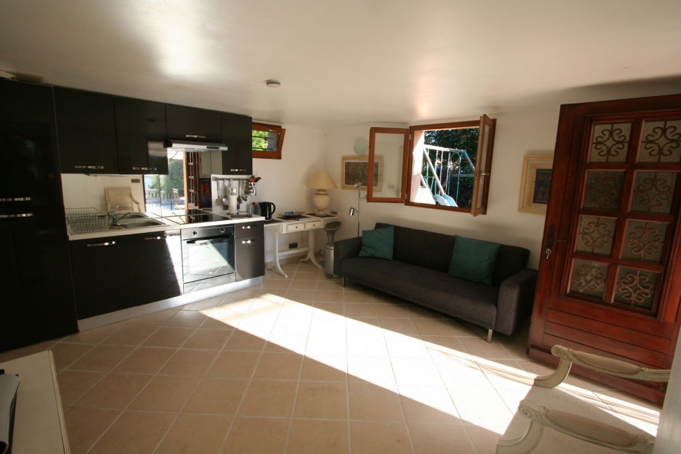 The Garden Apartment sleeps 6 guests in three bedrooms. Two of the bedrooms can be configured as doubles or twin singles, and the third is a twin room. A spacious master bedroom includes an en suite shower room with WC, bidet, and basin. A separate family bathroom with bath, walk-in shower, and WC serves the remaining bedrooms. The living room overlooks the pool and opens into a fully equipped kitchen with a central cooking island and breakfast bar. French doors lead directly to a covered dining veranda with garden and pool views—perfect for group meals and evening barbecues.
