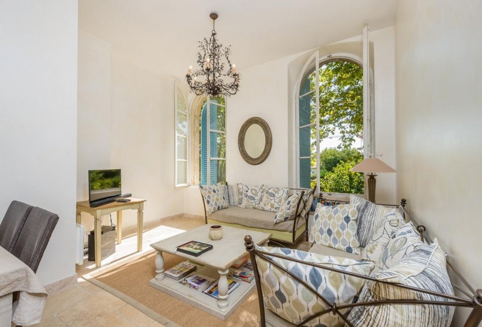 Apartment Chabaud is a stylish first-floor, two-bedroom holiday apartment offering 64m² of light-filled living space with tall ceilings, large windows, and tranquil views over the landscaped garden and shared 16m x 8.5m swimming pool.