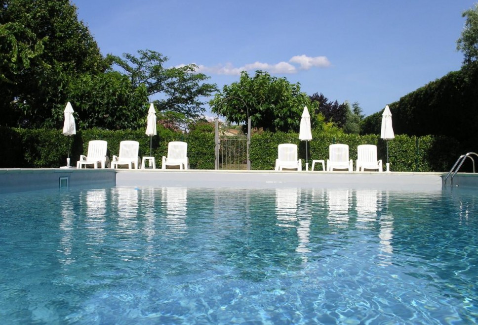 Private garden access with a designated outdoor dining area and sun loungers by the pool